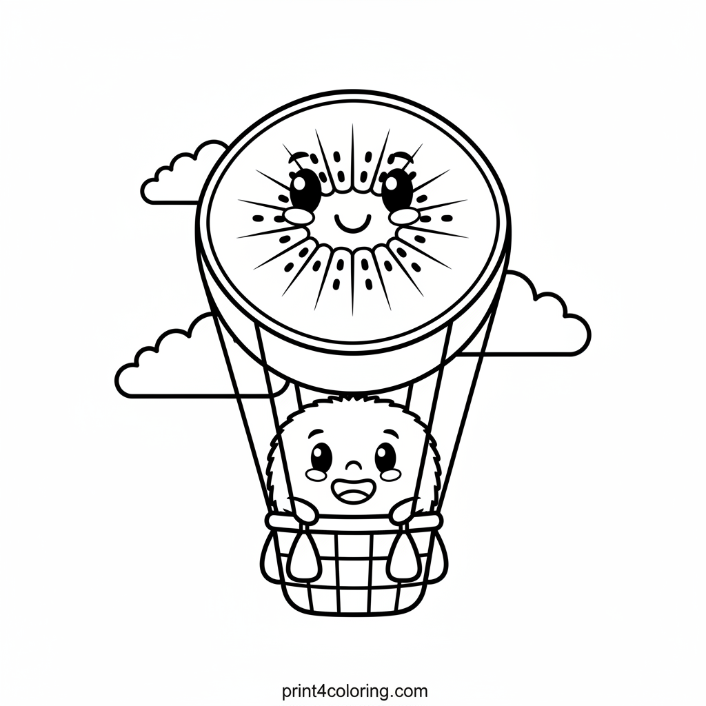 Join a cheerful kiwi fruit character as it embarks on an exciting adventure! Peeking from the basket of a charming hot air balloon, shaped like a giant, happy kiwi slice, our fruity friend floats gently among soft, puffy clouds. This delightful scene invites you to add vibrant colors to its sky-high journey.