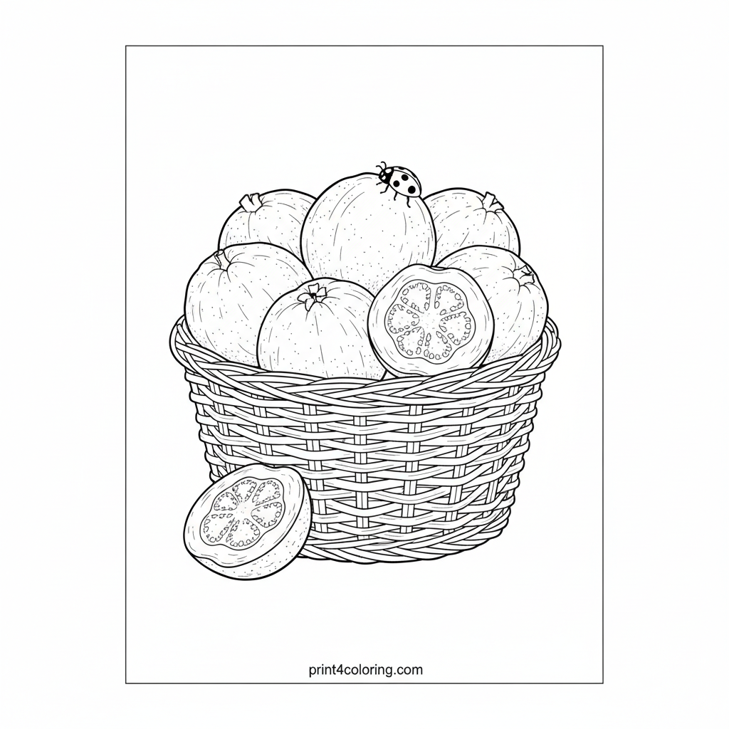 Explore a charming still life scene with a rustic basket overflowing with sweet guavas. Some are whole, others sliced open to reveal their juicy interior. A tiny, friendly ladybug crawls on one fruit, adding a delightful detail. Perfect for detailed coloring fun and a sweet artistic challenge!