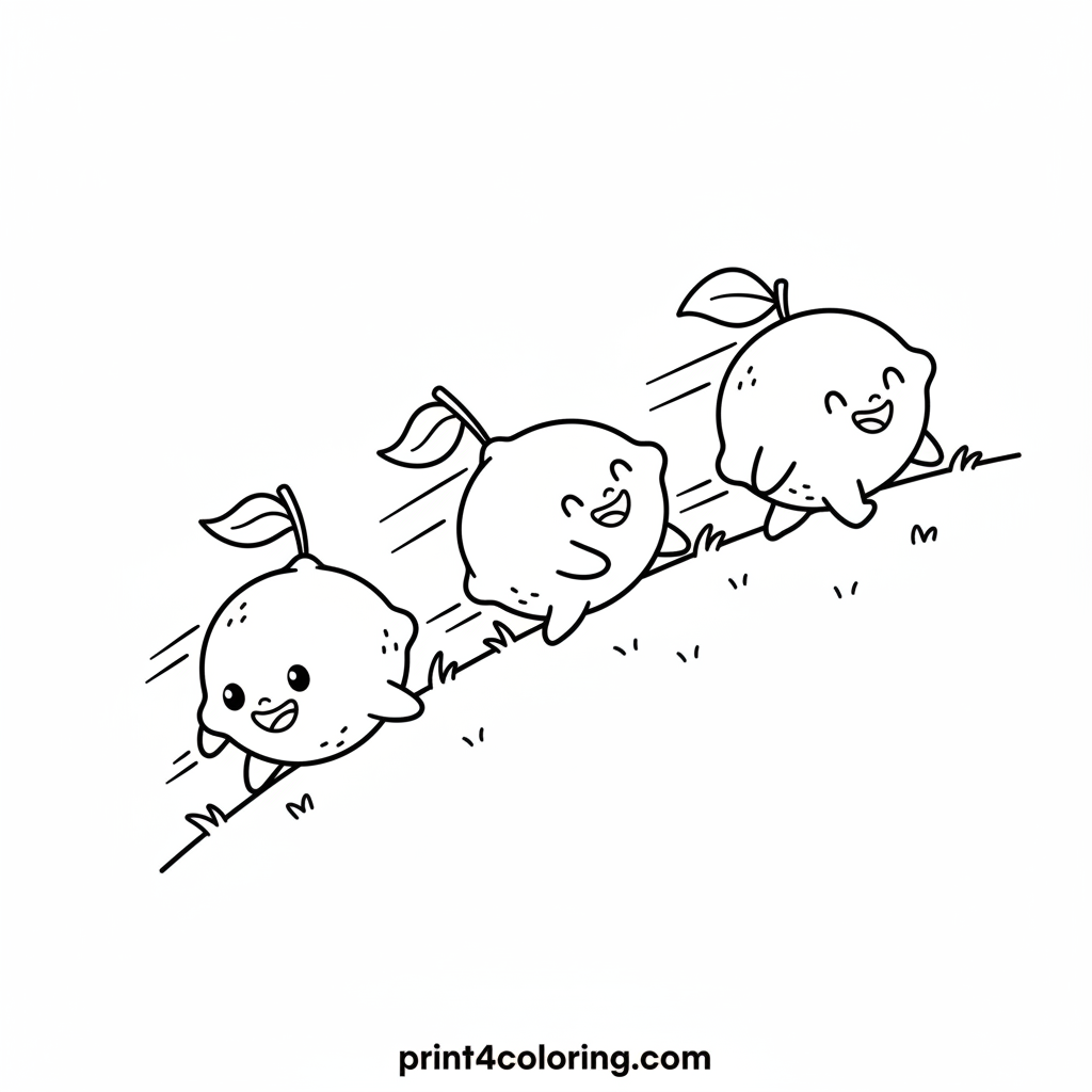 Get ready for an exciting race with three happy lemons! Watch them giggle and zoom down a gentle grassy hill, their little leaf flags waving in the breeze. This delightful scene is full of movement and cheer, perfect for little artists to bring to life with bright colors and imagination.