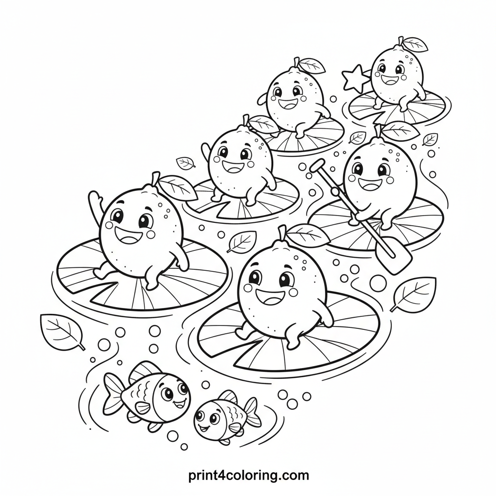 Join our cheerful lime friends as they embark on a magical journey across a sparkling pond! Each little lime smiles brightly, gently floating like a tiny boat on a giant lily pad. Look closely to spot the happy fish swimming playfully beneath them. This delightful scene invites you to add vibrant colors to their watery adventure!