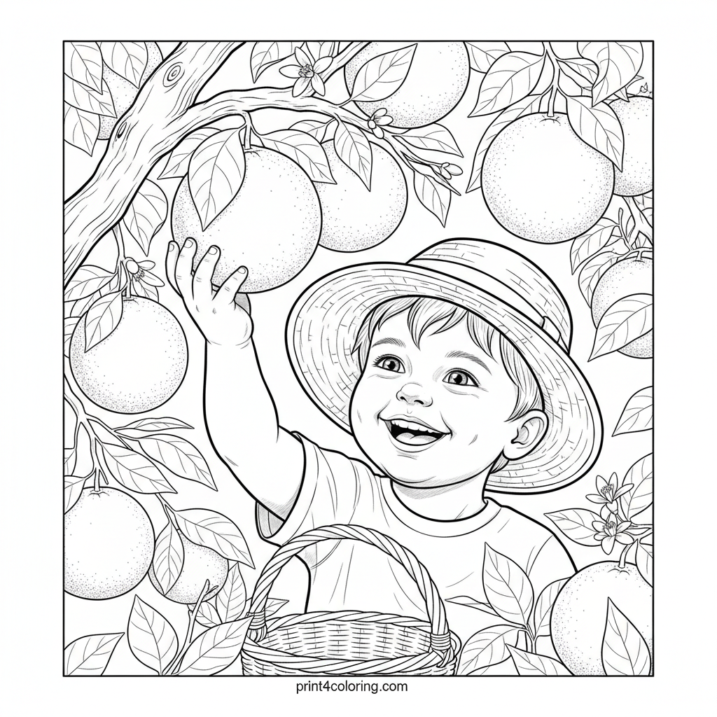 Join a cheerful child in a wide-brimmed hat as they gently pick a juicy grapefruit from a detailed tree. Plump grapefruits hang among realistic leaves, ready for harvest. A woven basket patiently waits at their feet, eager to be filled with the sweet, tangy fruit. A delightful scene celebrating nature's bounty!