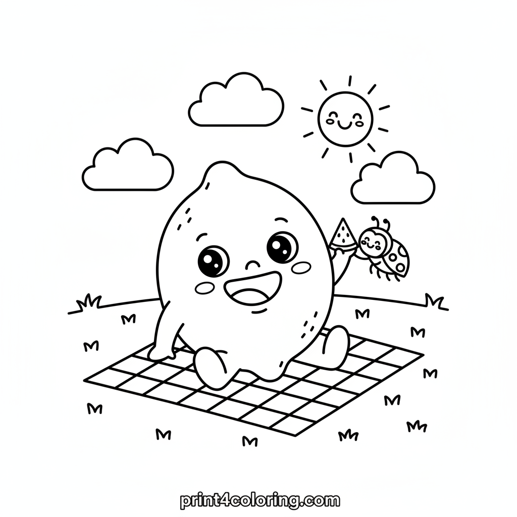 Join Little Lemon for a delightful picnic! This cheerful, round lemon character enjoys a sunny day on a cozy checkered blanket. With a big smile, Little Lemon shares a tiny, sweet slice of watermelon with a cute ladybug friend. A perfect scene for young artists to bring to life with bright, happy colors!