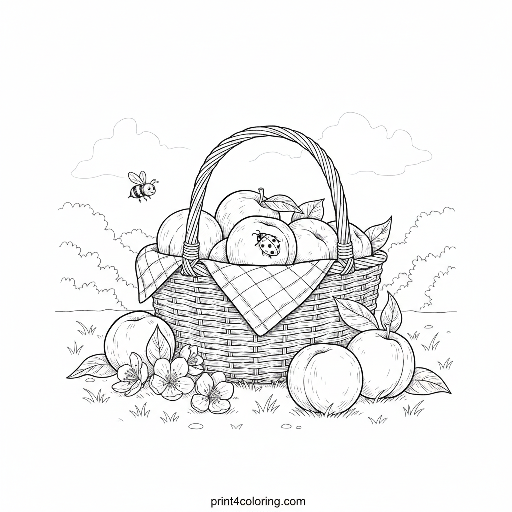 Dive into a delightful summer scene! Color perfectly ripe peaches nestled in a rustic picnic basket with a cheerful checkered cloth. Spot a tiny ladybug resting on one fuzzy peach and a shy bee hovering nearby, drawn to the sweet scent. Delicate peach blossoms and leaves complete this charming, detailed picnic for you.