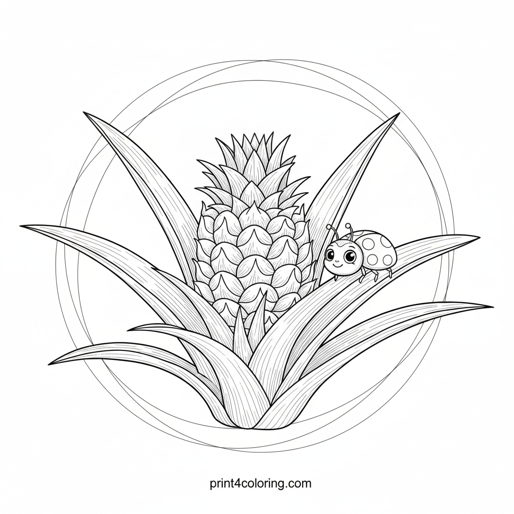 Explore the charm of a young pineapple sprout, just beginning its journey! This detailed botanical scene features a tiny pineapple fruit nestled among spiky, vibrant leaves. A friendly ladybug friend adds a touch of whimsy, perfect for a cozy coloring adventure. Discover the beauty of nature's growth!