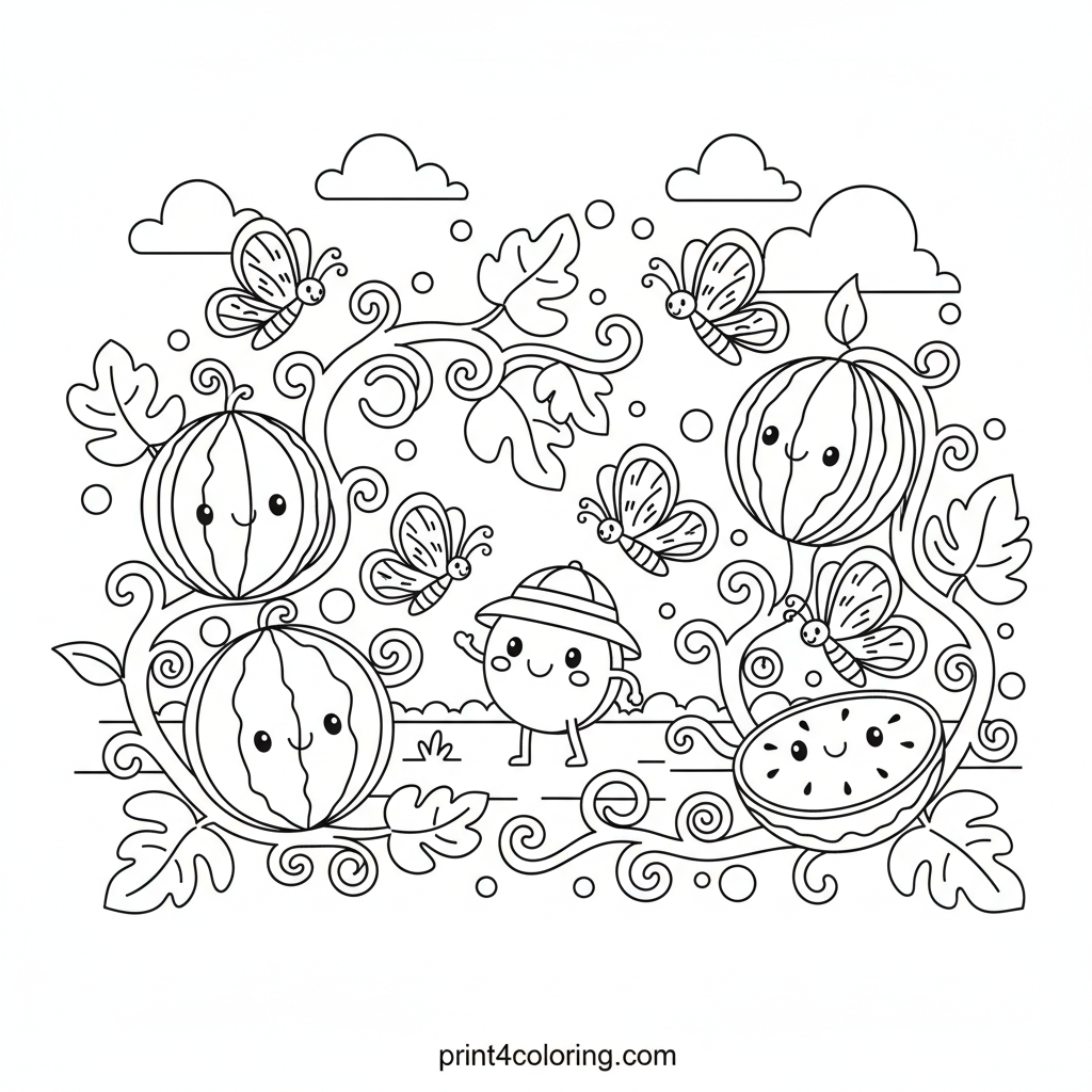 Join Little Seed on an amazing adventure through a magical garden! Discover giant, smiling watermelons growing on winding vines. Watch as cheerful butterflies with beautiful watermelon-slice wings flutter by. This delightful scene is bursting with sweet summer fun, ready for you to color with your brightest crayons and wildest imagination!