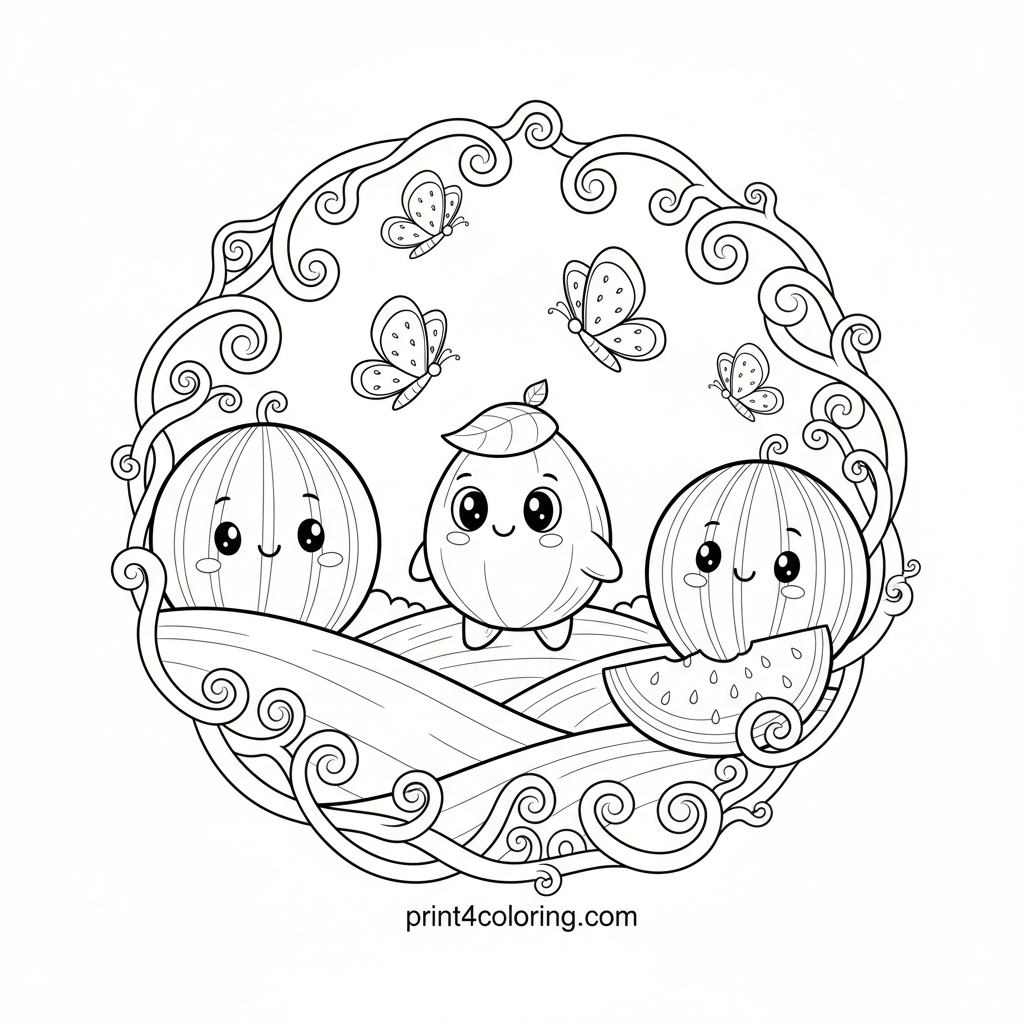 Join a tiny, happy seed on an amazing adventure through a whimsical garden! Discover giant, smiling watermelons growing on curly green vines. Watch as beautiful butterflies with wings like watermelon slices flutter by. This cute and cozy scene is bursting with summer fun and sweet surprises, just waiting for your colors!