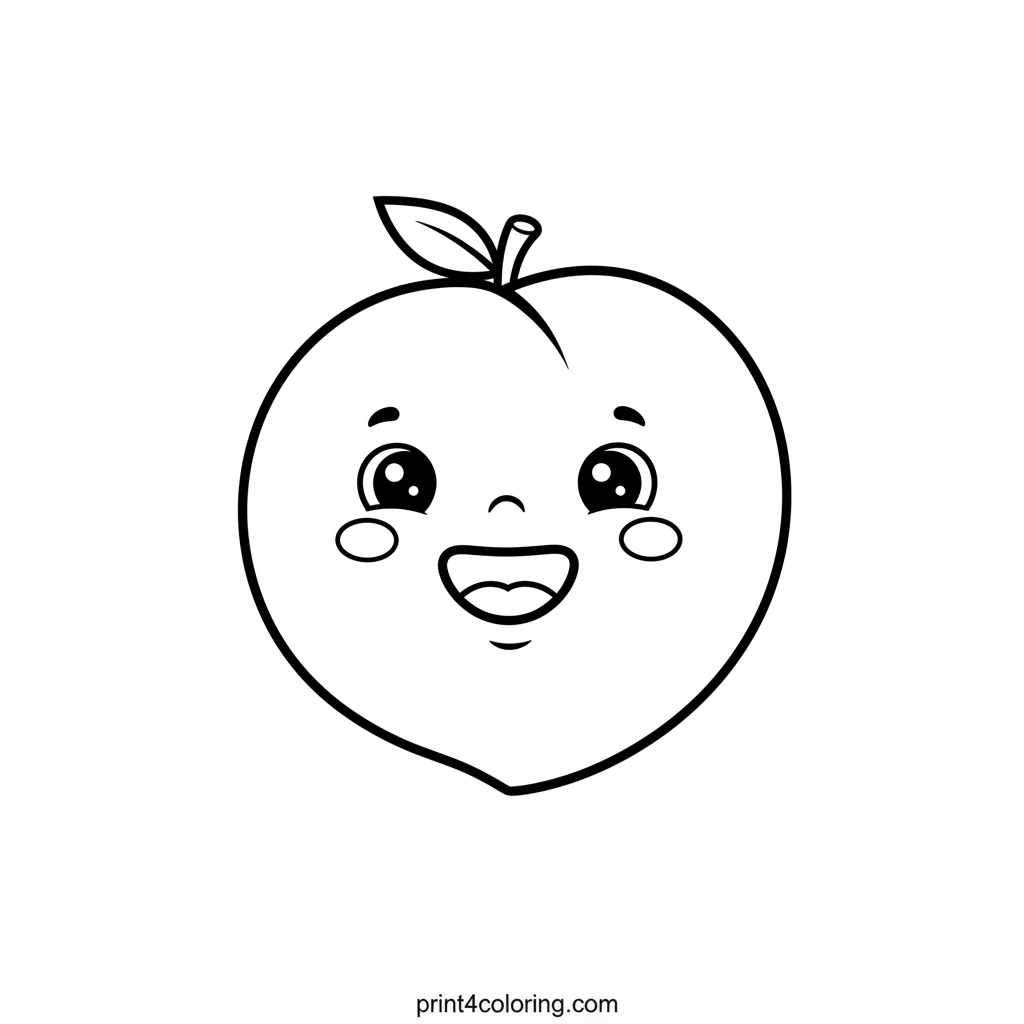 Meet your new sweet peachy friend! This big, round peach has the happiest smile and rosy blush marks on its cheeks, making it look extra cheerful. A tiny green leaf sprouts from its top, ready for you to add vibrant colors. Imagine the juicy fun and bright hues you can bring to this delightful fruit portrait!