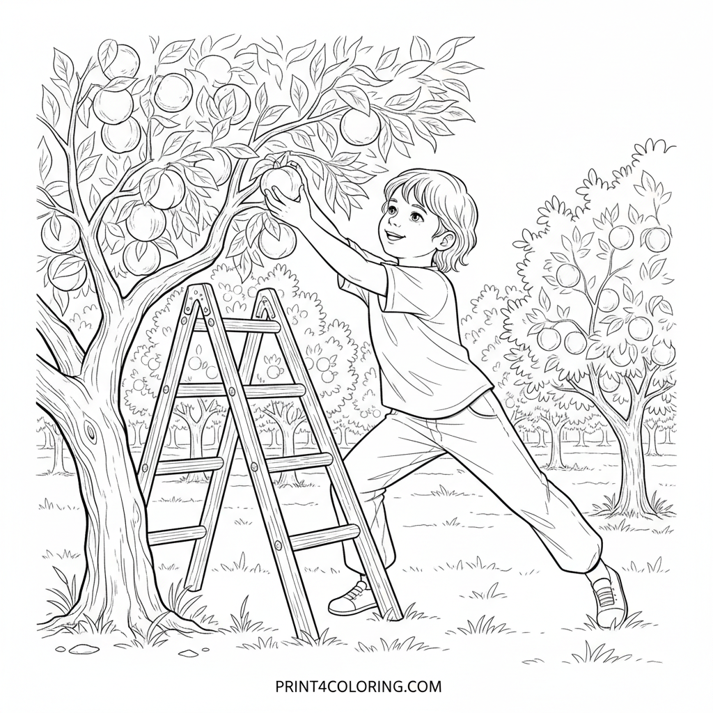 Dive into a sunny orchard scene where a child gently picks a ripe nectarine from a low branch. A sturdy ladder waits nearby, surrounded by rows of fruit-laden trees under a clear sky. This detailed page invites you to bring the joy of harvest to life with your colors.