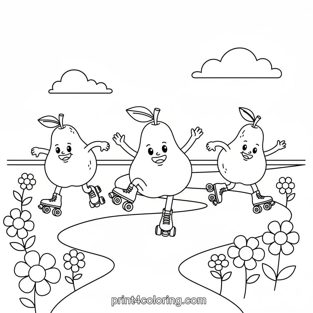 Get ready for a fruity adventure! Three cheerful pears are zooming down a gentle, wavy path on roller skates, each with a big smile. One pear strikes a silly pose! Simple flowers line the path, adding to the joy. Grab your crayons and color this delightful roller disco scene!