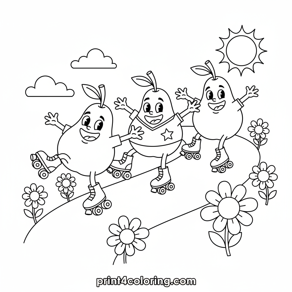 Get ready for a fruity adventure! Three cheerful pears are zooming down a wavy path on roller skates, each with a big smile. One pear is doing a silly pose, leg up! Simple flowers dot the path's edge. A delightful scene, perfect for bright colors!