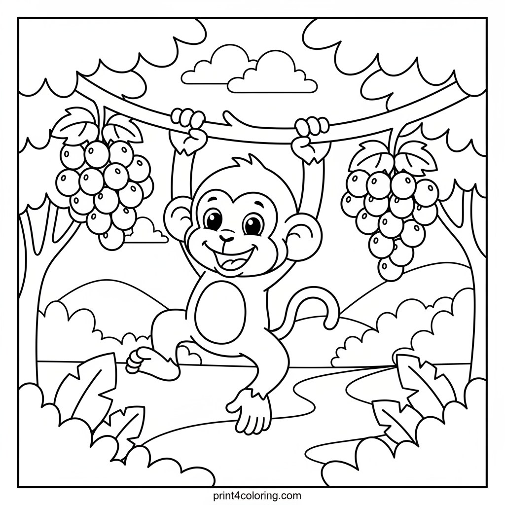 Join a happy little monkey as it swings with glee from a sturdy grape vine! Imagine the jungle breeze as you color its fur, the lush leaves, and the sweet, juicy bunches of grapes hanging nearby. This cheerful scene is full of fun, inviting you to bring vibrant life to the monkey's playful adventure.