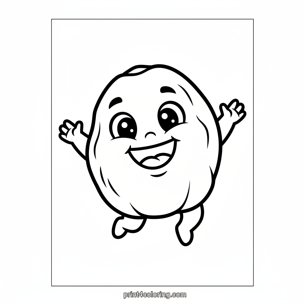 Join Prune on a super bouncy adventure! This happy little prune character, wearing tiny shoes, is leaping high over a small puddle, creating a magnificent splash. With arms outstretched and a huge grin, Prune is having the best time. Get ready to add vibrant colors to this joyful moment of pure fun!