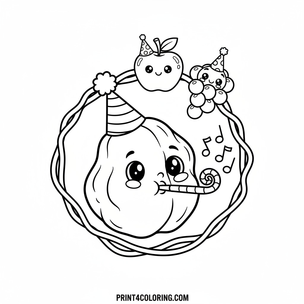 Join Pruney, the cheerful and slightly wrinkly prune, at his super silly hat party! He's wearing a tiny, brightly colored hat and blowing a festive party horn. Look closely to spot his friendly fruit pals in the background, all sporting their own hilarious headwear. Get ready to add vibrant colors to this cozy, fruit-filled celebration!