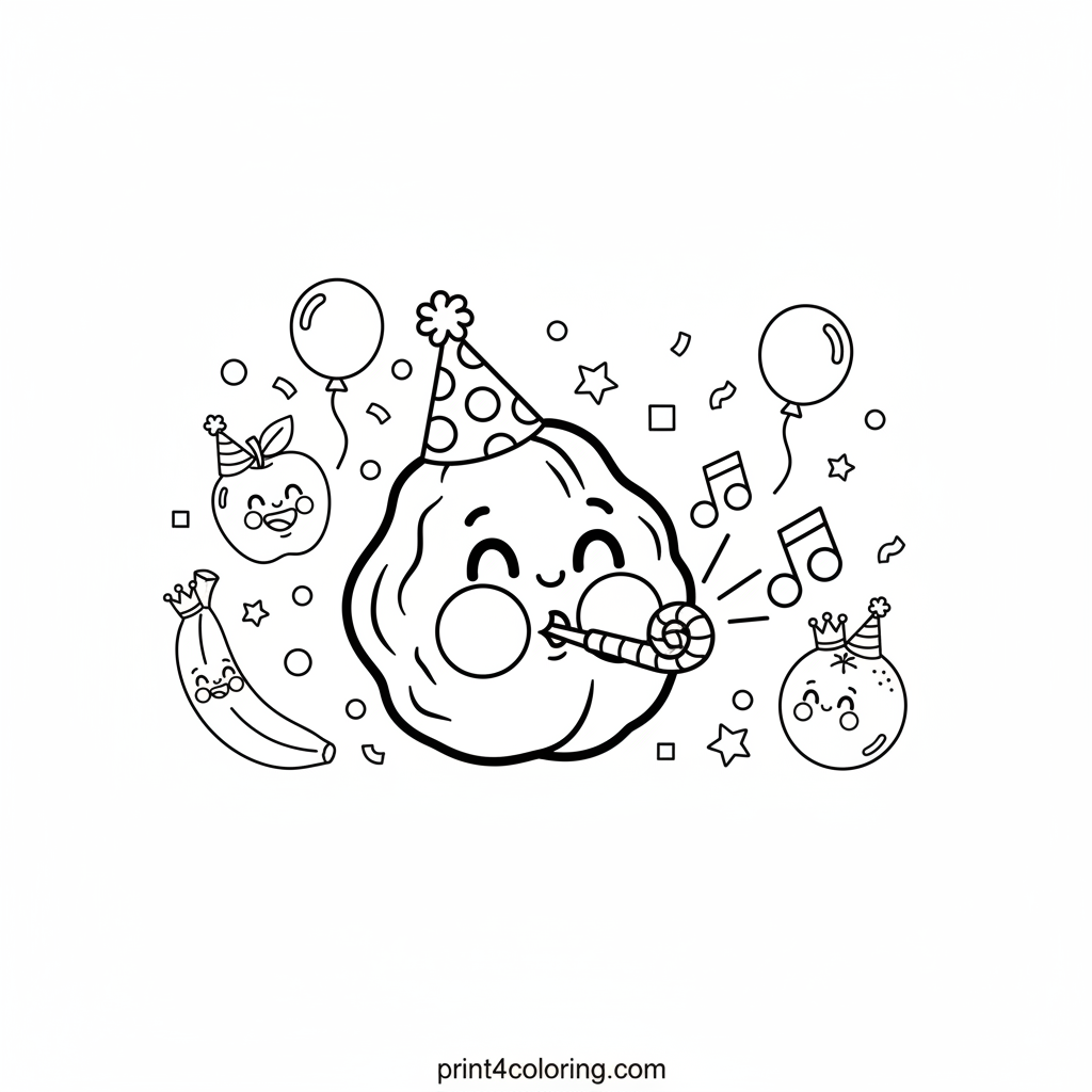 Pruney the cheerful prune is having the best party ever! He's wearing a tiny, bright hat and blowing a party horn. Look closely and you'll spot his fruity friends in the background, all sporting their own hilarious hats. Get ready to add vibrant colors to this super silly celebration and bring the fun to life!