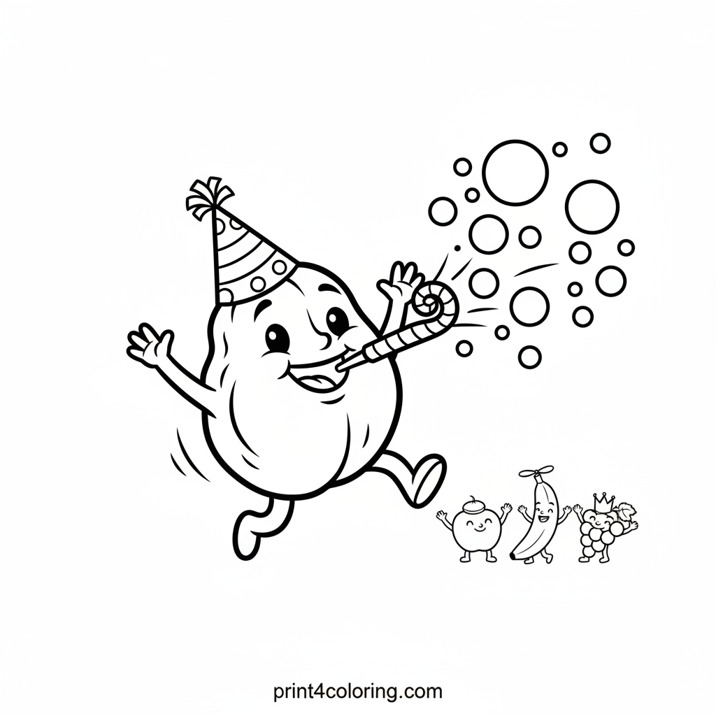 Join Pruney, the happiest prune, as he celebrates with a big smile and a tiny, colorful party hat! He's blowing a party horn, and his fruit friends are all around, wearing their own funny hats. Get ready to add vibrant colors to this super silly and sweet fruit celebration!