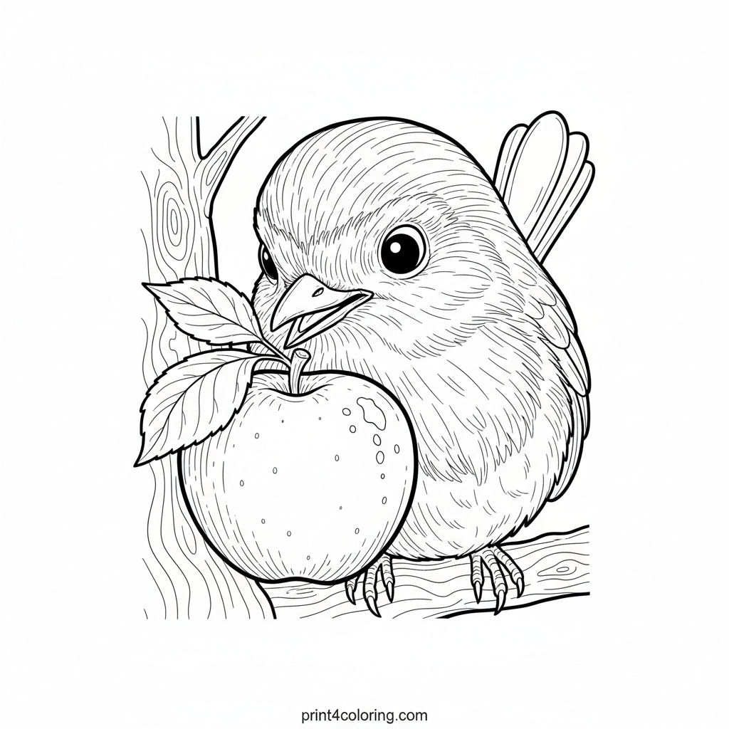 Delight in this intricate close-up of nature's snack time! A friendly little robin is carefully perched on a branch, gently pecking at a juicy, ripe apple. This detailed botanical illustration features lush leaves, textured bark, and plump fruit, inviting you to bring its beauty to life with your colors.