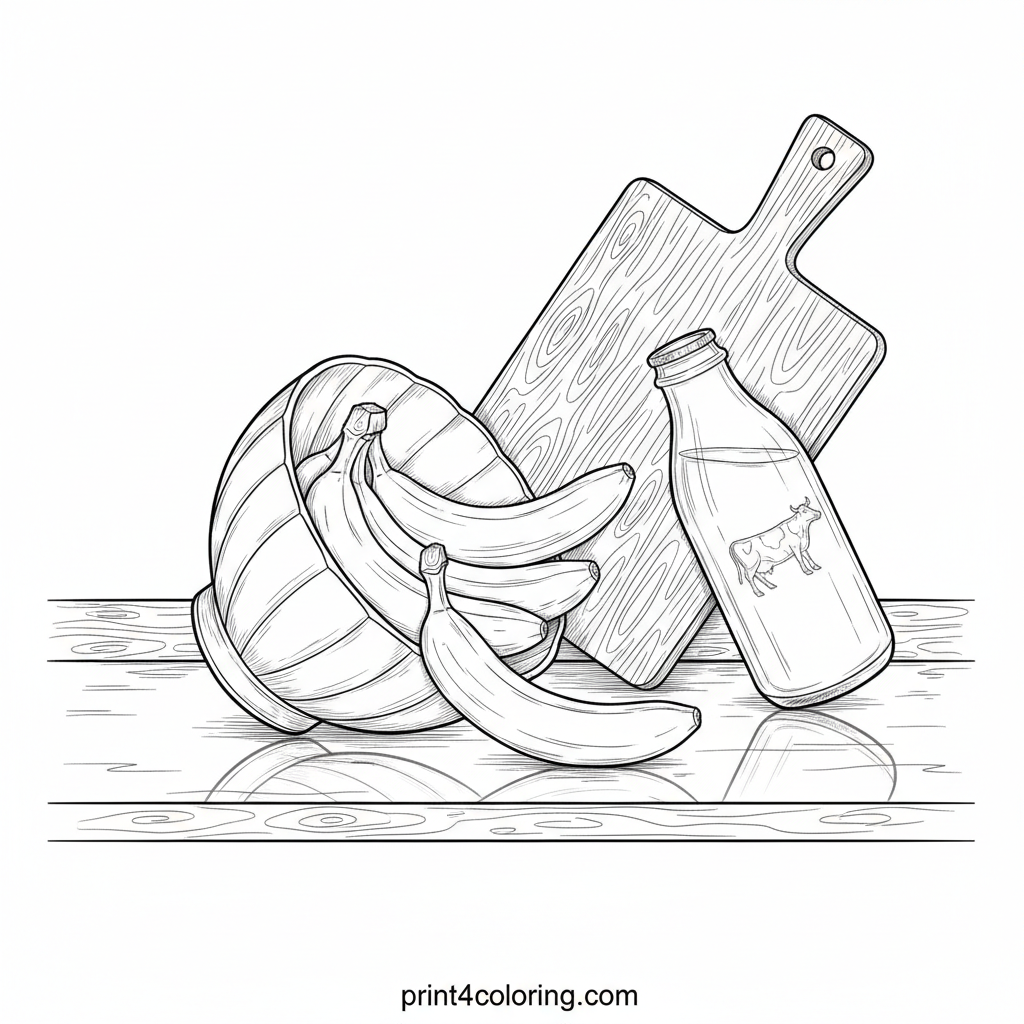 Step into a cozy kitchen scene with this detailed still life! A bowl overflows with ripe bananas on a polished counter. Adjacent are a vintage milk bottle and a rustic cutting board, all rendered with realistic textures. Bring this delicious scene to life with vibrant colors and artistic shading, perfect for experienced colorists.