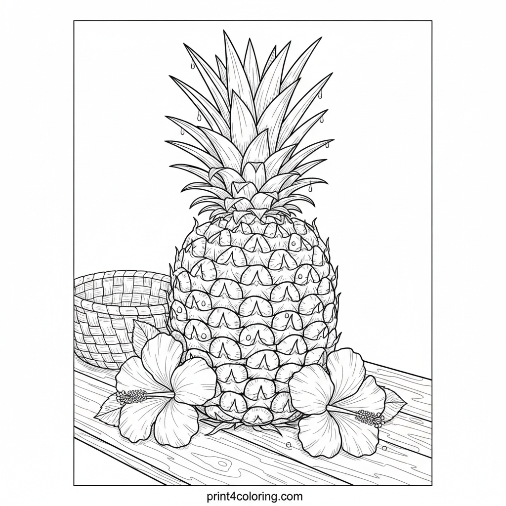 Dive into the detailed world of a freshly harvested pineapple! This expert-level coloring page features a realistic close-up of a juicy pineapple resting on a rustic wooden table. Explore intricate textures, delicate hibiscus flowers, and sparkling water droplets, bringing this tropical scene to vibrant life with your favorite colors.
