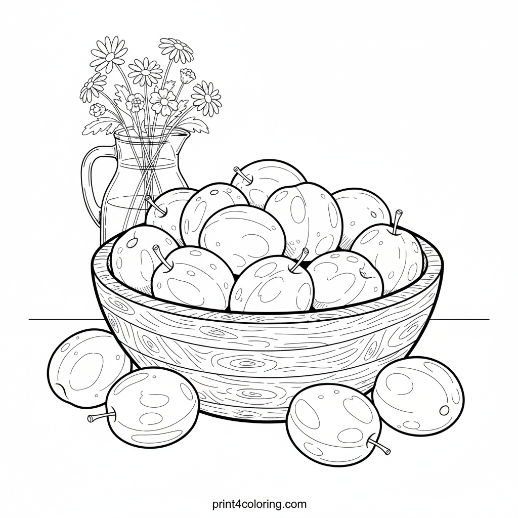 Dive into a delightful still life scene featuring a rustic wooden bowl overflowing with plump, juicy plums. Explore the textures of the wooden table, scattered plums with delicate stems, and a charming vintage glass pitcher holding a small bouquet of wildflowers in the background. A perfect page for expert colorists!