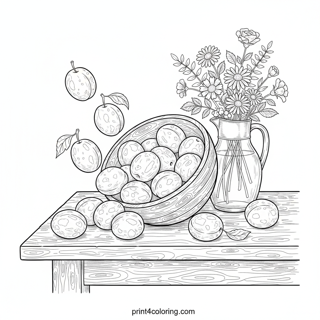 Dive into a beautiful still life scene featuring a rustic wooden bowl overflowing with plump, ripe plums. Scattered around, some plums still boast their delicate stems. In the background, a vintage glass pitcher holds a charming bouquet of wildflowers, inviting you to add vibrant colors to this bountiful harvest.