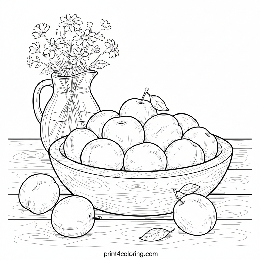 Uncover the beauty of a rustic still life. A wooden bowl overflows with plump, ripe plums on a textured table, some with delicate stems. A vintage glass pitcher holds a small bouquet of wildflowers, inviting expert colorists to bring this cozy, natural scene to vibrant life.