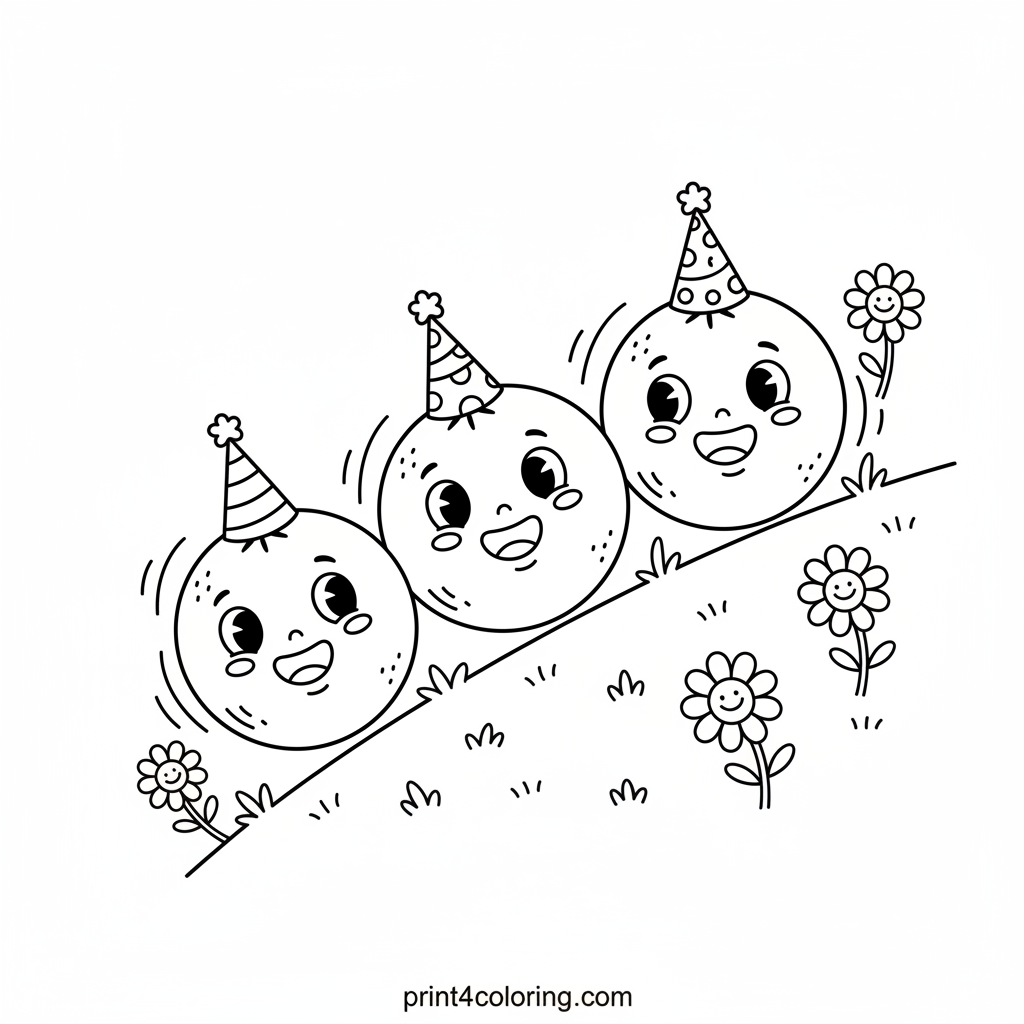 Imagine three super happy oranges, wearing tiny party hats, giggling as they tumble down a soft, green hill! They're in a friendly race, rolling side-by-side, full of smiles and wobbly fun. Who do you think will reach the bottom first? Grab your crayons and bring this joyful orange adventure to life!