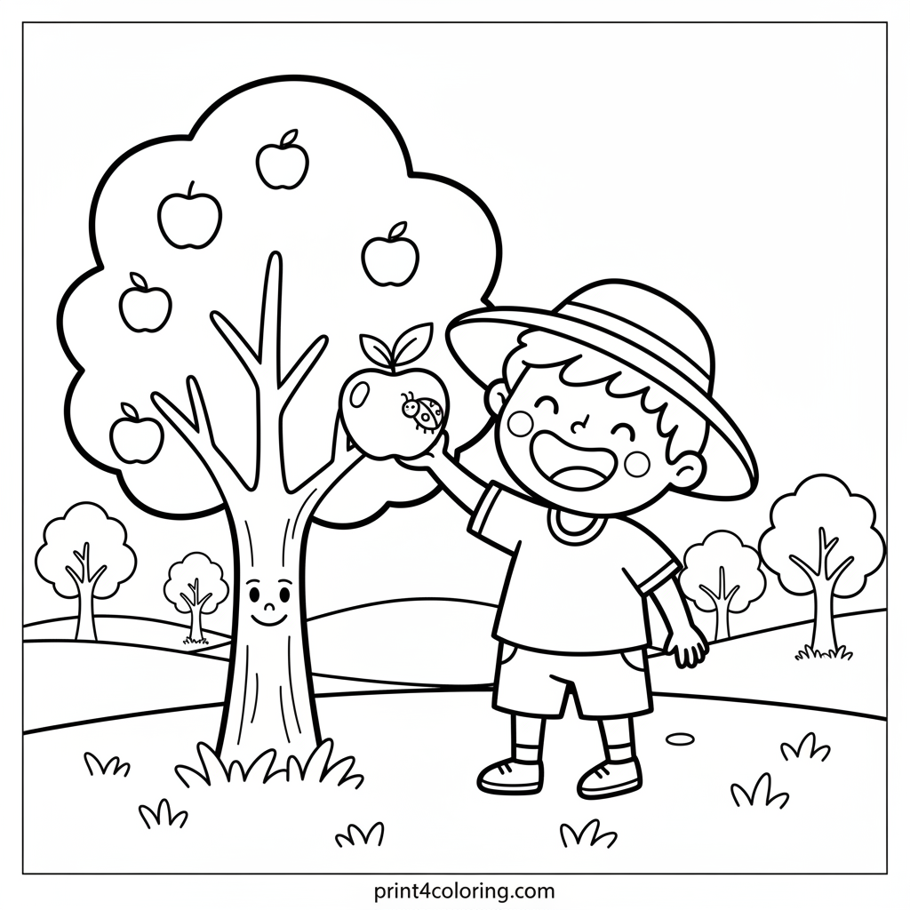 Join a happy child in a sun hat on a wonderful apple picking day! This delightful scene features a smiling child reaching for a big, shiny apple from a friendly tree. Look closely and you'll spot a cute ladybug on a leaf nearby. A perfect picture to color for a fun autumn day!