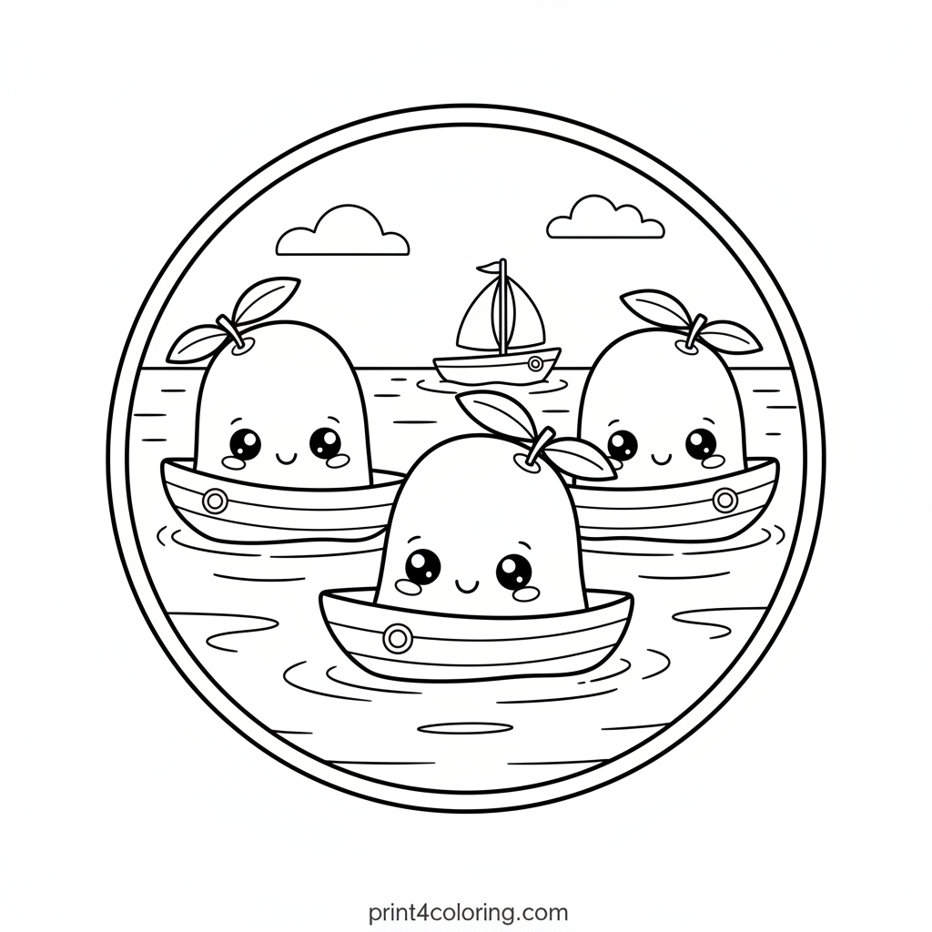 Embark on a sweet adventure with these adorable, smiling mangoes! Watch them float gently like little boats on calm, clear blue water, their happy faces beaming. A tiny, cute sailboat sails peacefully in the background, adding to this cozy tropical scene. Perfect for a relaxing coloring escape!