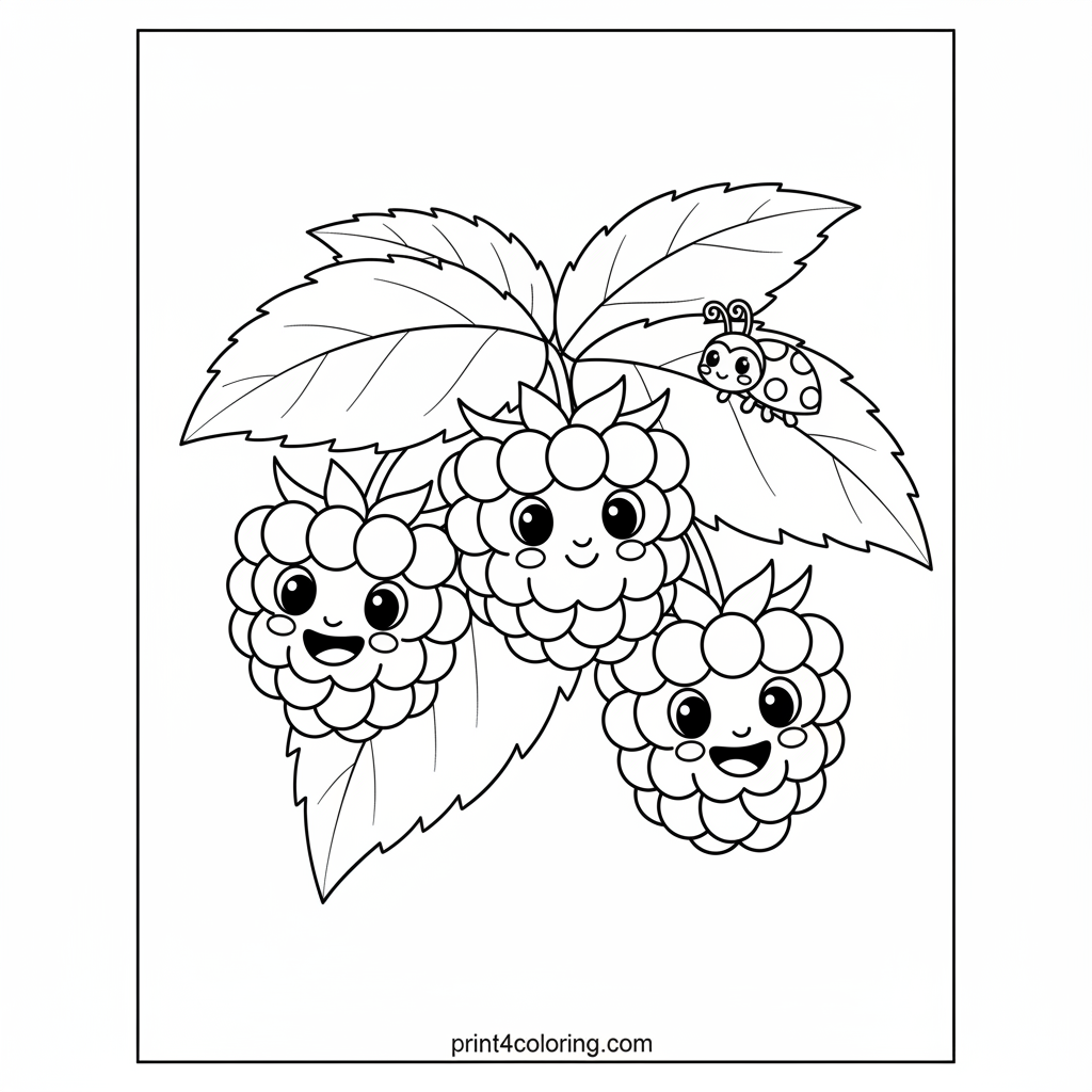 Get ready to color a delightful close-up of a happy raspberry patch! Meet several plump, smiling raspberries hanging sweetly on their leafy bush. Look closely and you might spot a tiny, friendly ladybug exploring a nearby green leaf. This cheerful scene is just waiting for your bright colors to bring it to life!