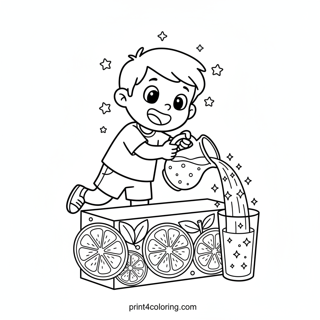 Get ready for a refreshing adventure! This delightful coloring page features a happy child at a whimsical lemonade stand, crafted from giant lemon slices. Watch as they pour bubbly, sparkling lemonade into a tall glass, surrounded by magical star shapes. A perfect scene for a sunny day of coloring fun!