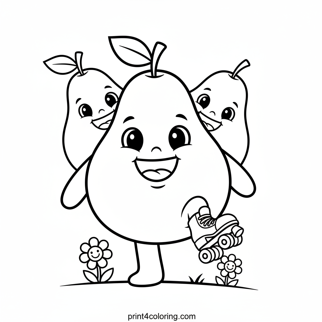 Get ready for some fruity fun! Three happy pears are zipping and zooming on their roller skates down a wavy path. One pear shows off a silly pose, while colorful flowers bloom nearby. Grab your crayons and add vibrant hues to this delightful, speedy adventure. It's a sweet ride!