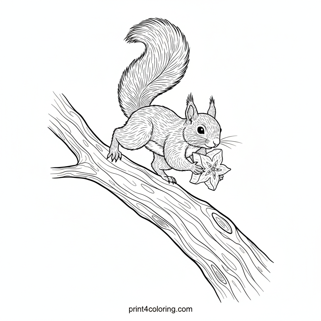 Witness a charming squirrel, bushy tail high, enjoying a juicy star fruit! Perched on a detailed tree branch, its tiny paws carefully hold the tropical snack. Intricate fur and bark textures offer a delightful challenge to bring this woodland scene to vibrant life.