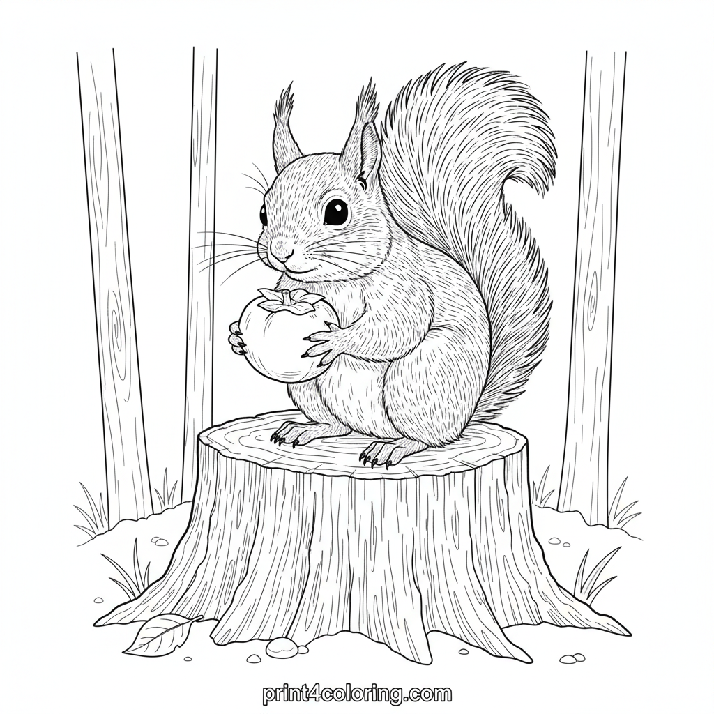 Join a curious squirrel as it enjoys a delicious, freshly fallen persimmon fruit! Perched on a textured tree stump in a sun-dappled forest, this busy little friend carefully holds its sweet treat. Bring this vibrant autumn scene to life with your favorite colors, capturing the warmth and wonder of nature's bounty.