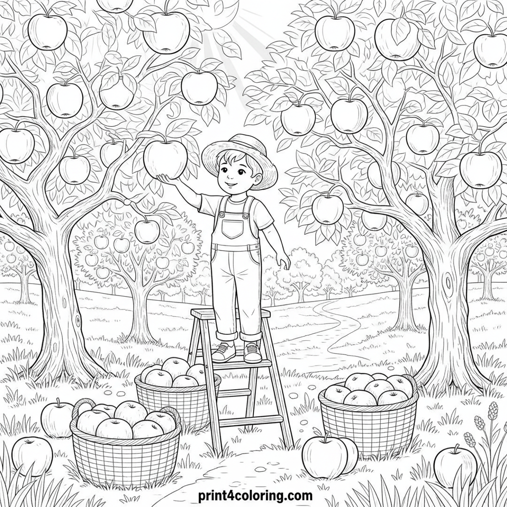 Sunny Apple Picking Day in the Orchard Coloring Page