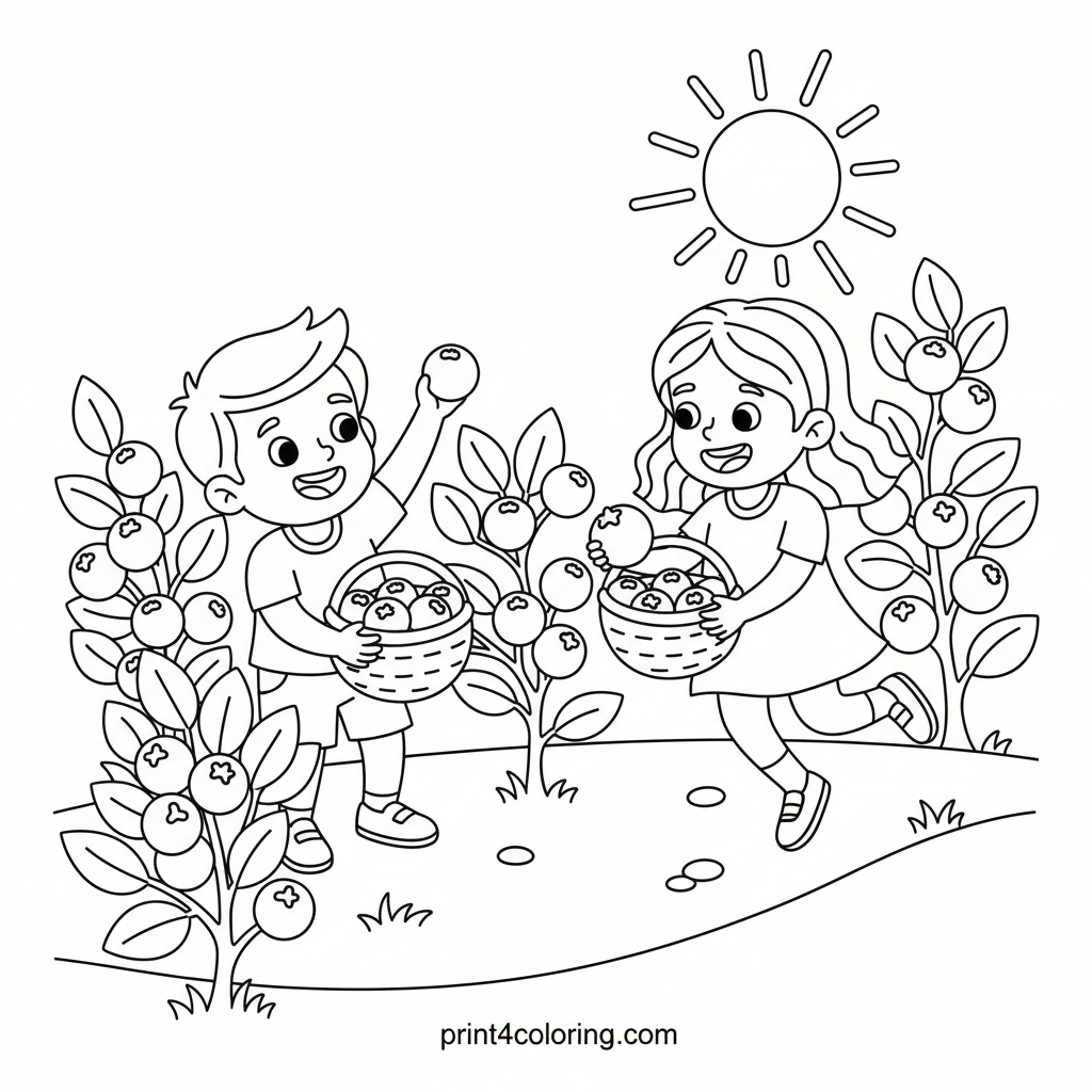 Join a happy boy and girl on a sunny day as they gather delicious blueberries! Their baskets are getting full with sweet, juicy berries from the bushes. Imagine the tasty treats they'll make! Grab your crayons and add vibrant colors to this delightful berry-picking adventure in the field.
