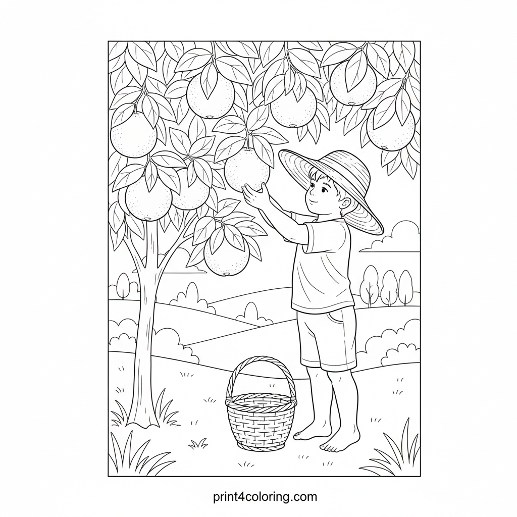 Join a cheerful child on a sunny day, carefully picking ripe grapefruits from a lush, detailed tree. Explore the intricate leaves and plump fruits, ready to fill a woven basket at their feet. This delightful scene invites you to add vibrant colors to a bountiful harvest, celebrating nature's sweet gifts.