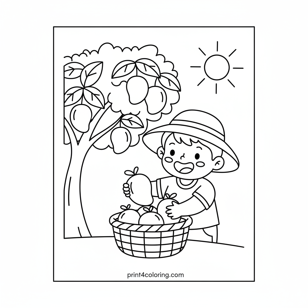 A happy child with a wide smile enjoys a sunny mango harvest, carefully placing ripe mangoes into a basket. The big mango tree is full of green leaves and more juicy fruit. This cheerful scene captures the joy of summer, perfect for coloring with bright, warm shades!