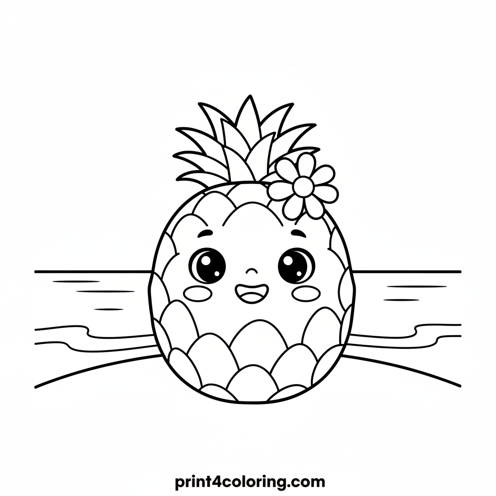 Meet our cheerful Sunny Pineapple Pal, radiating joy on a warm sandy beach! This adorable, round pineapple has a big friendly smile, sparkling eyes, and a sweet little flower peeking from its leafy crown. Imagine a sunny day as you bring this happy character and its beachy surroundings to life with your favorite colors.