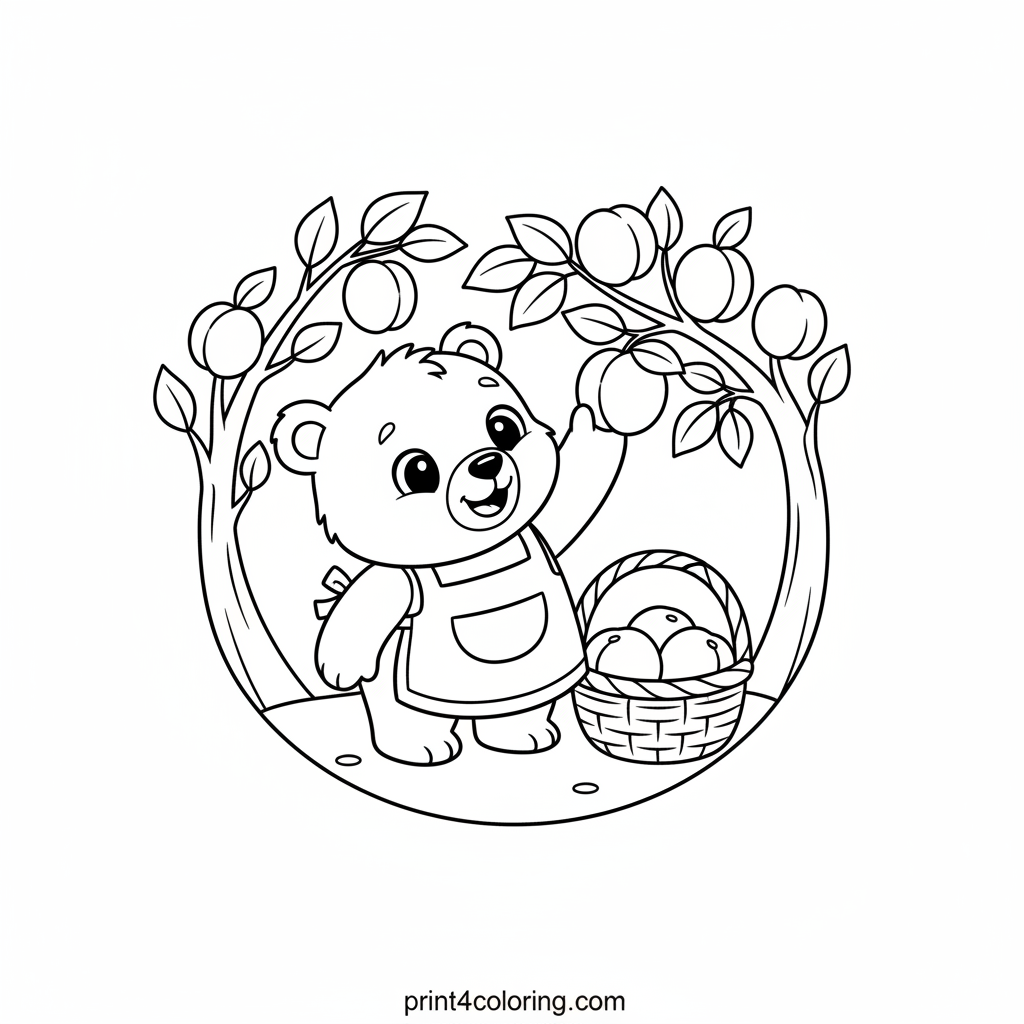Join a cheerful little bear cub on a delightful apricot harvest adventure! Our furry friend, wearing a cute apron, carefully picks a juicy apricot from a friendly tree. A wicker basket nearby holds more golden treasures. Add vibrant colors to this cozy scene, bringing the sweet fruit, happy bear, and sunny orchard to life!