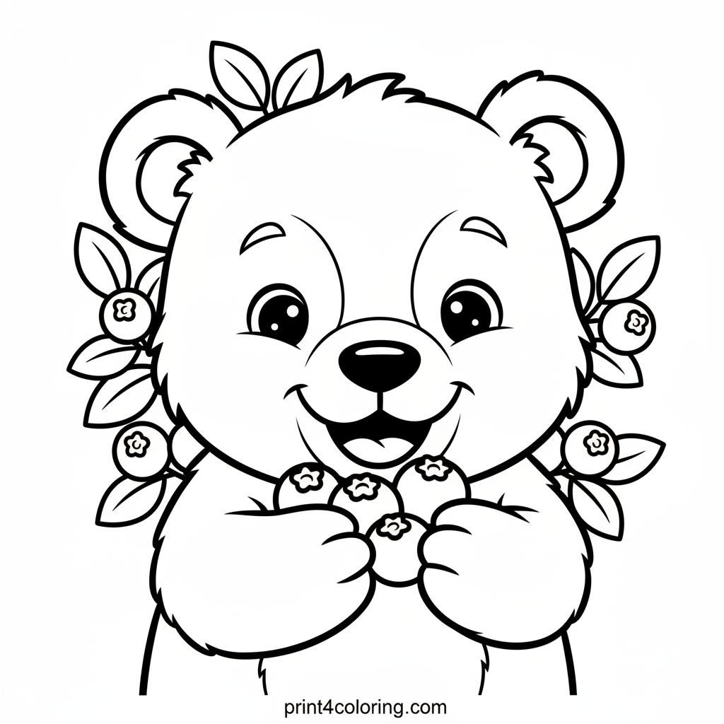 Dive into the forest with this adorable close-up of a happy bear cub! With its soft fur and big, friendly eyes, this little one is enjoying a tasty treat. It's gently holding juicy blueberries, surrounded by leafy bushes. A perfect scene for young artists to color and imagine a sweet forest snack!