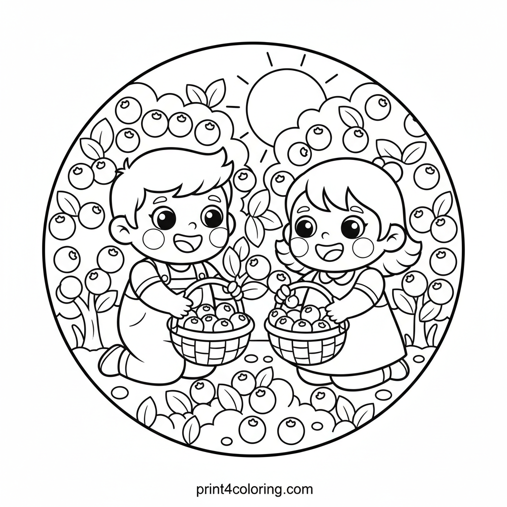 Join two happy children on a sunny blueberry picking adventure! Watch them carefully gather big, juicy blueberries from lush bushes into their overflowing baskets. This adorable scene captures the joy of a summer harvest, perfect for little hands to color with bright blues and greens. Get ready for a sweet, colorful journey!
