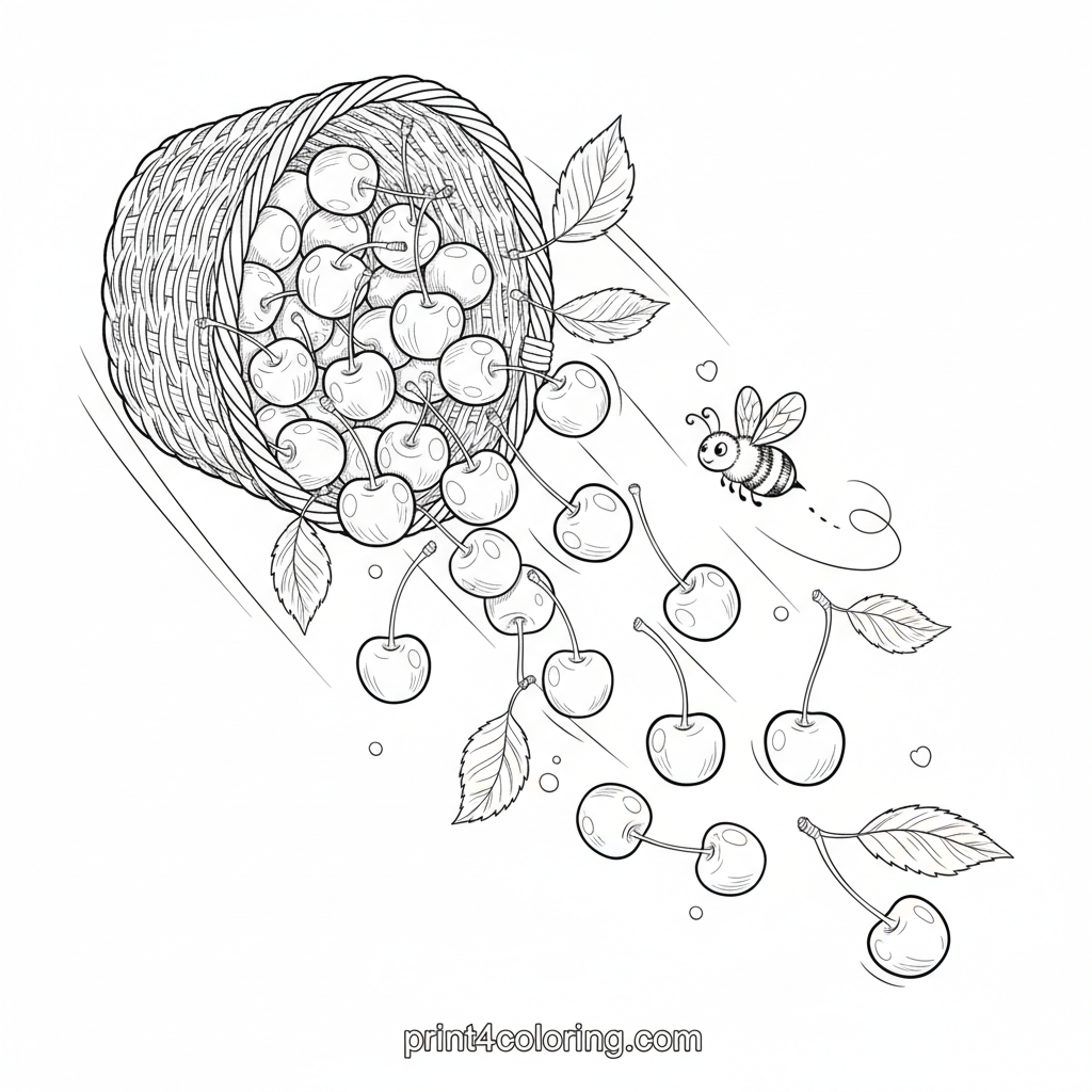 Imagine a sun-kissed wicker basket brimming with juicy, ripe cherries, each one glistening. Look closely, and you'll spot a tiny, friendly honeybee gracefully hovering, ready to collect nectar. This expert-level page invites you to bring this vibrant summer scene to life with your favorite colors, highlighting every detail from the woven basket to the tiny bee's wings.