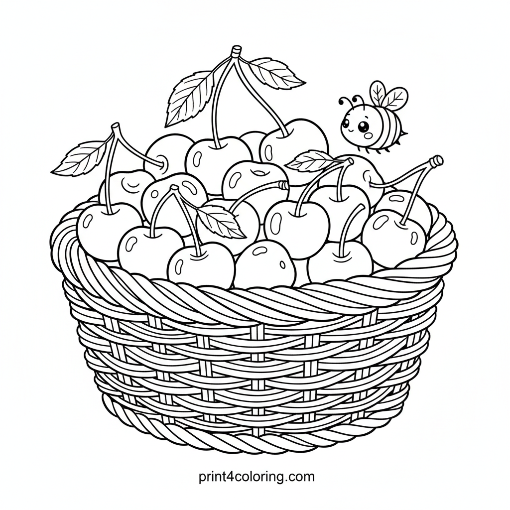 Immerse yourself in a cozy scene featuring a charming woven wicker basket brimming with plump, glossy ripe cherries. Observe the delicate leaves and stems, and spot the tiny, friendly honeybee gently buzzing nearby. This detailed illustration offers a delightful challenge perfect for expert colorists.