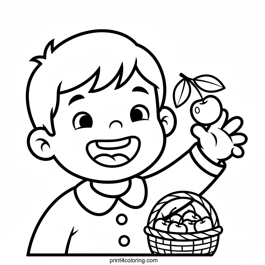 Discover the joy of cherry picking! This coloring page features a happy child with a big smile, gently plucking a bright red cherry from a leafy branch. A basket full of delicious fruit sits at their feet. Bring this delightful harvest scene to life with your favorite colors!