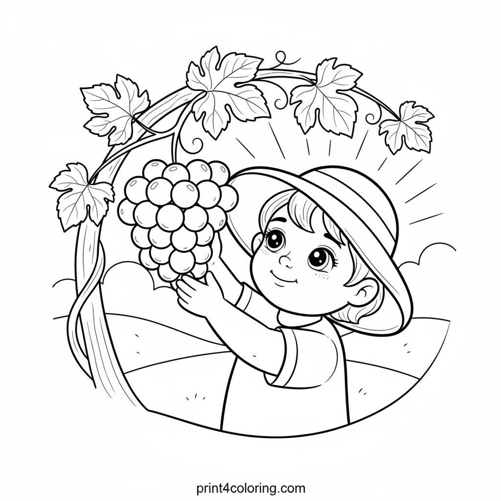 Join a happy child in a sun hat, gently picking luscious grapes from a vibrant vine. This cozy vineyard scene, with its detailed leaves and rolling hills, captures the joy of a peaceful, sun-dappled harvest. A perfect page for a relaxing coloring adventure!
