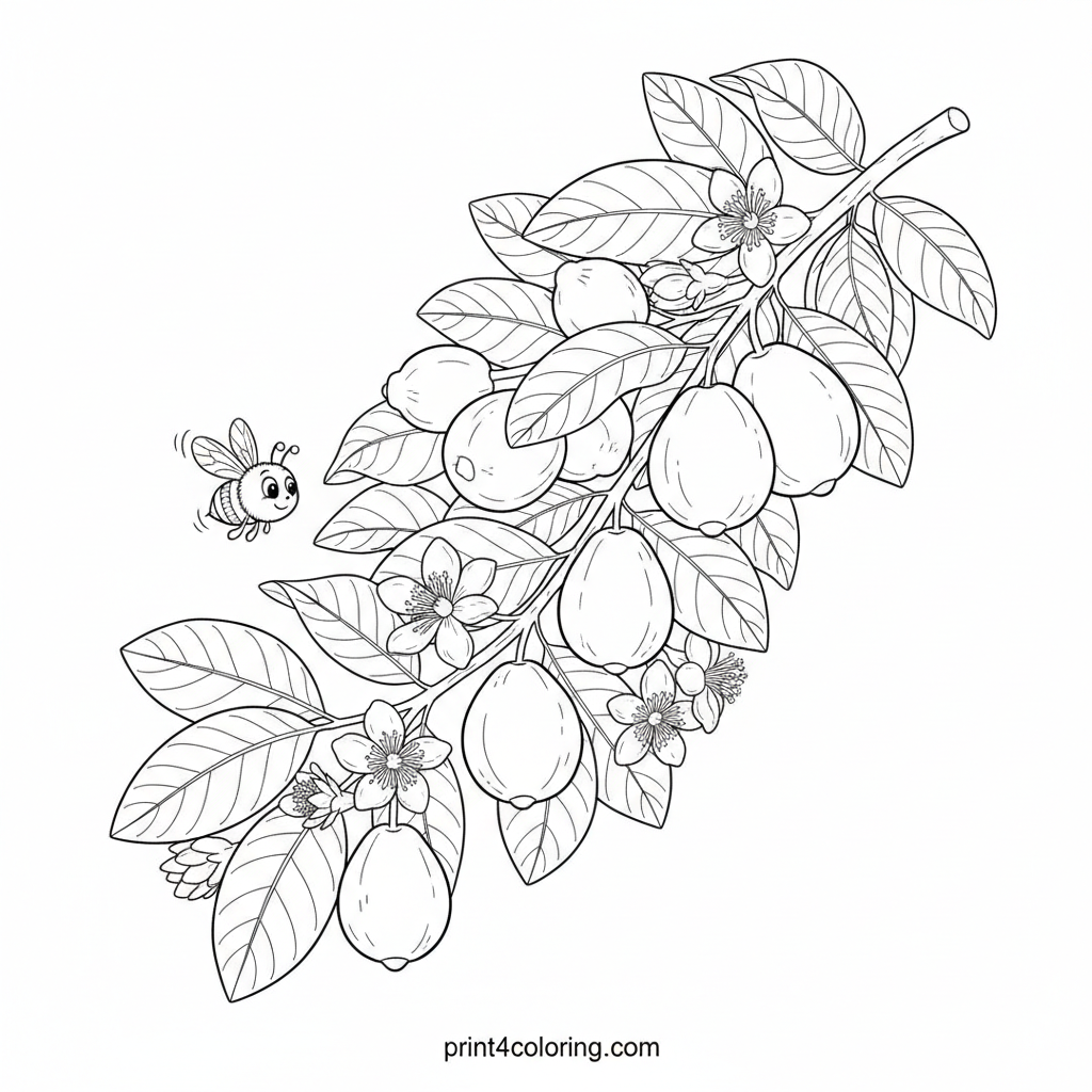 Explore a vibrant guava tree branch bursting with life! Color ripe yellow guavas and green unripe ones, surrounded by lush leaves and delicate white blossoms. A tiny, friendly bee is busy collecting nectar, making this a sweet scene to bring to life with your favorite colors.