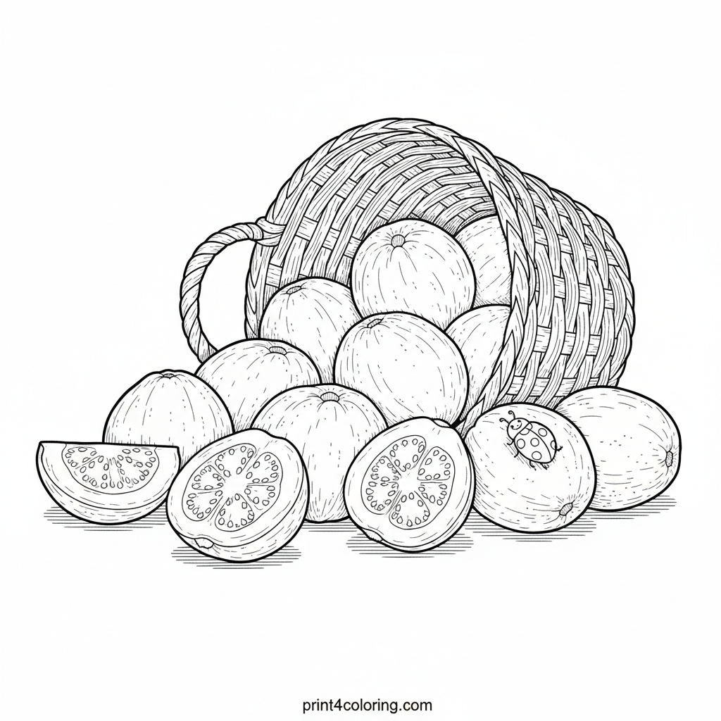 Dive into a delightful still life scene featuring a rustic woven basket brimming with sweet guavas. Discover whole fruits with textured skin and halves revealing their juicy insides. A tiny, friendly ladybug is playfully exploring one of the guavas, adding a touch of life to this charming harvest composition. Perfect for detailed coloring!
