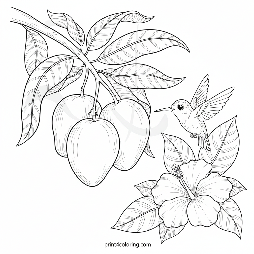 Sweet Mango Harvest with Hummingbird Friend Coloring Page
