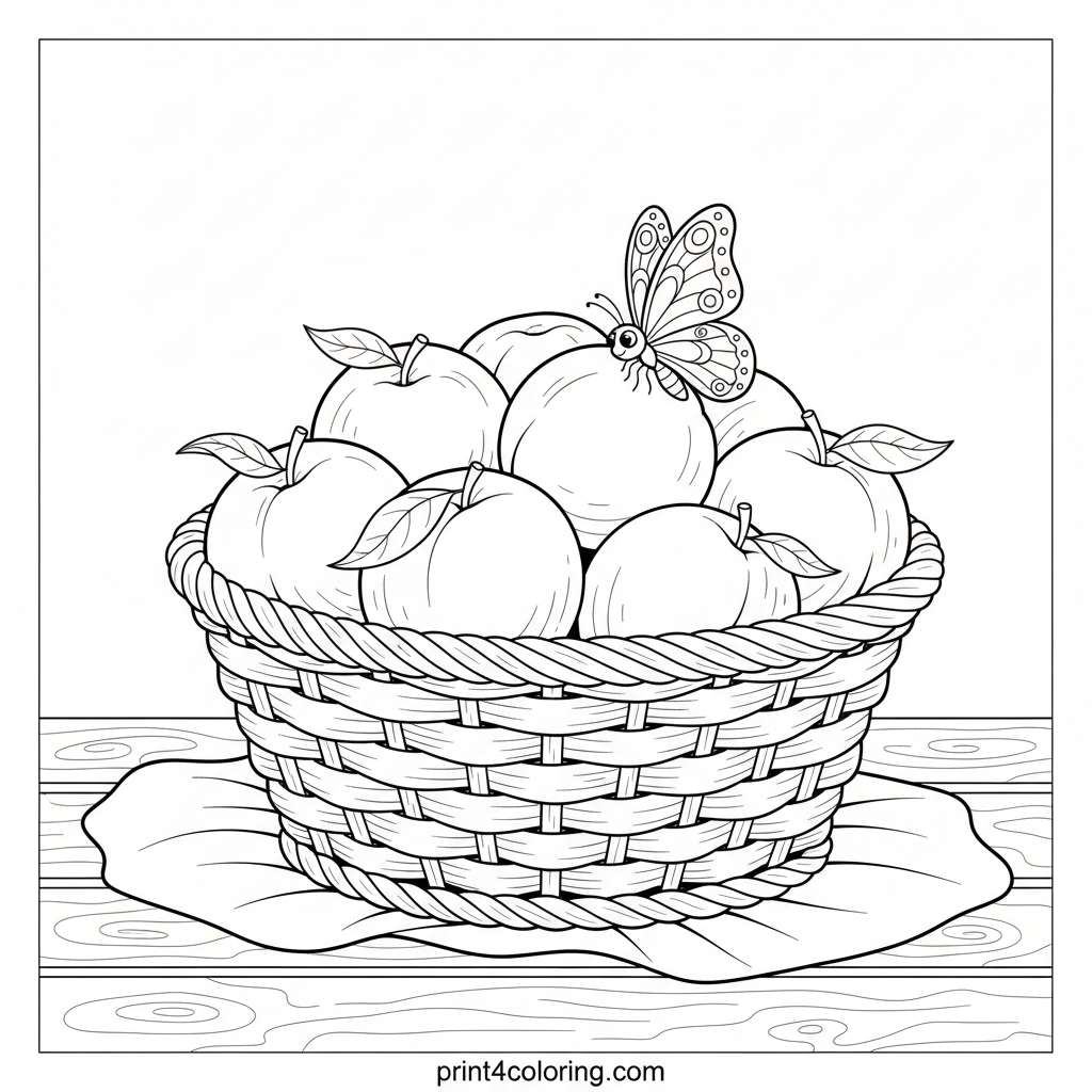 Imagine a cozy scene with a charming vintage basket overflowing with juicy, ripe nectarines! Some even have tiny leaves. A beautiful butterfly with amazing patterned wings has landed gently on one of the sweet fruits. Get ready to add vibrant colors to this delightful harvest, bringing warmth and sunshine to your page!