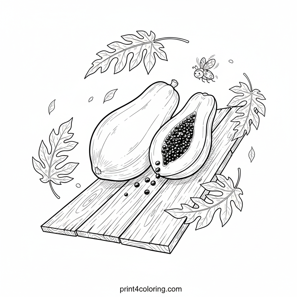 Explore a delightful still life featuring a whole and a sliced papaya, revealing their juicy seeds. They rest on a rustic wooden surface, surrounded by beautiful, detailed papaya leaves. A tiny, friendly ladybug adds a touch of charm, exploring the vibrant foliage. A perfect page for expert colorists!